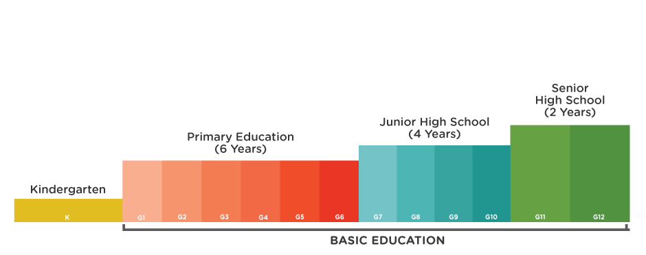 The K to 12 Program covers Kindergarten and 12 years of basic education (six years of primary education, four years of Junior High School, and two years of Senior High School [SHS]) to provide sufficient time for mastery of concepts and skills, develop lifelong learners, and prepare graduates for tertiary education, middle-level skills development, employment, and entrepreneurship.